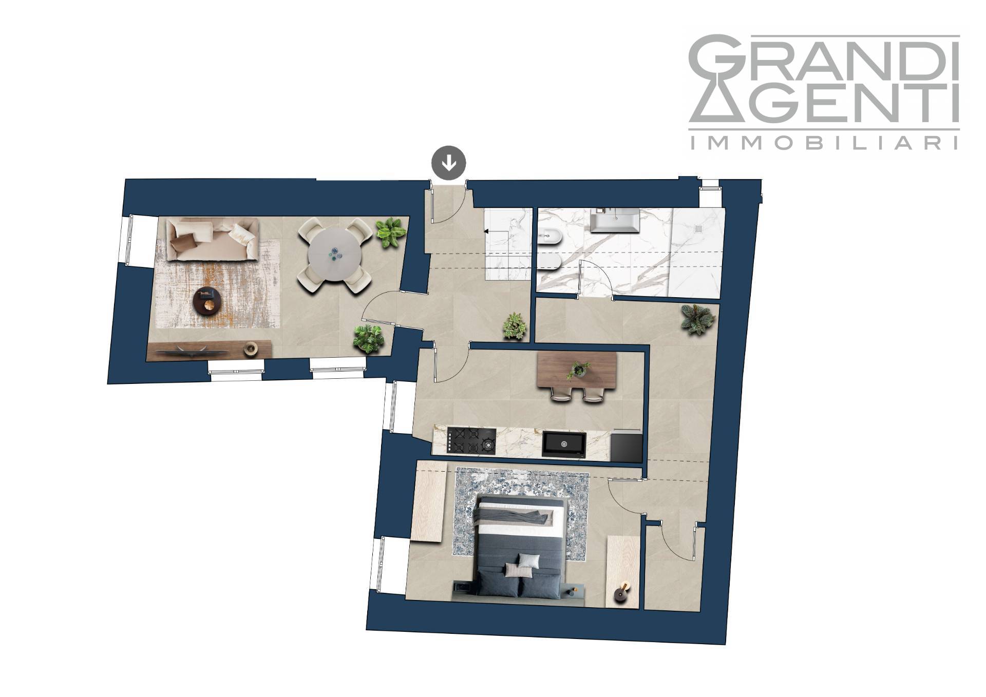 Attualmente l'Appartamento è suddiviso in cucina, soggiorno, camera e bagno ma con una ristrutturazione base può ospitare un soggiorno con angolo cottura, una camera matrimoniale, una cameretta e un bagno.
